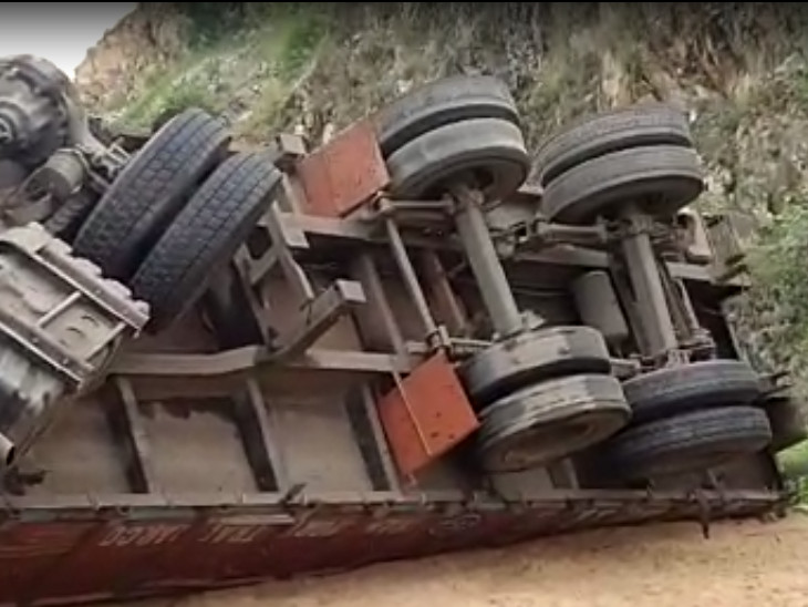 सोमवार सुबह जिले के गोगुंदा इलाके में हाईवे पर घसियार गांव के पास गाय को बचाने के चक्कर में बजरी से भरा ओवरलोड ट्रेलर पलट गया।