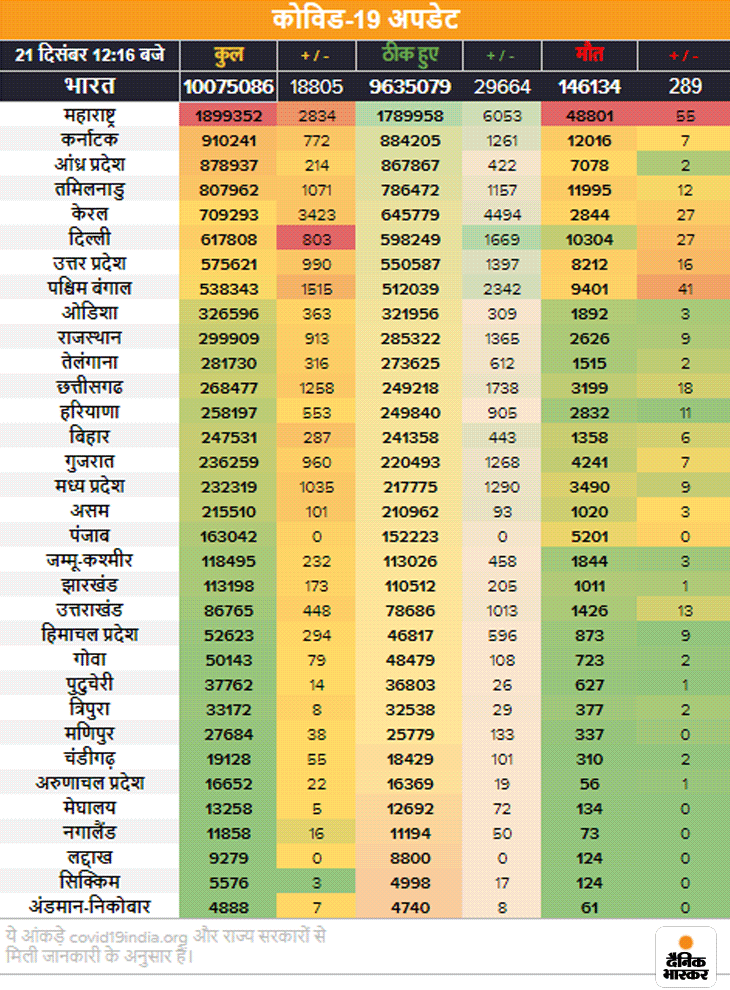 देश में अब तक 1 करोड़ 75 हजार लोग संक्रमण की चपेट में आ चुके हैं। इनमें 96 लाख 91 हजार 350 लोग ठीक हो चुके हैं, जबकि 1 लाख 46 हजार 134 मरीजों की अब तक मौत हो चुकी है। एक्टिव मरीजों की संख्या अब 3 लाख से कम हो गई है। ऐसा 163 दिन बाद हुआ है। अब 2 लाख 91 हजार 350 मरीज ऐसे हैं जिनका इलाज चल रहा है। इसके पहले 11 जुलाई को 2 लाख 91 हजार एक्टिव मरीज थे। ये आंकड़े covid19india.org से लिए गए हैं।