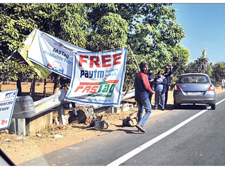 कार से जयपुर से सुबह 11 बजे बस्सी टोल प्लाजा के लिए रवाना हुए। 11.40 मिनट पर बस्सी से 5 किमी आगे राजाधोक टोल प्लाजा पर पहुंचे। कार को टोल से 500 मीटर पहले ही टोल पर तैनात मार्शलों ने रोक दिया। फास्टैग होने, नहीं होने के बारे में जानकारी ली। हमारी कार पर फास्टैग नहीं था। कार को खड़ी करा दी।