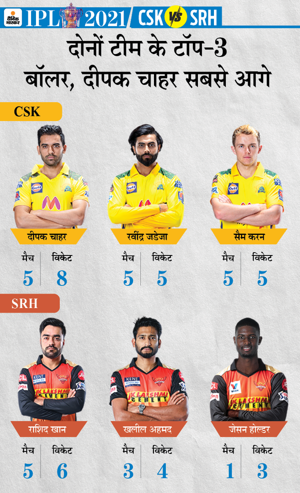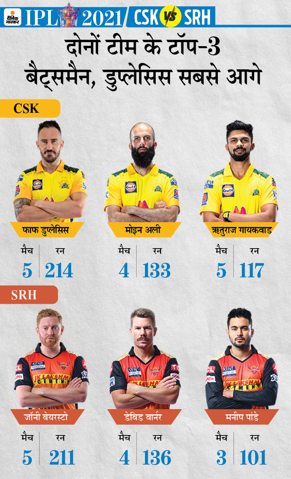 सनराइजर्स हैदराबाद के ओपनर डेविड वार्नर ने चेन्नई के स्पिनर्स रवींद्र जडेजा और इमरान ताहिर के खिलाफ 150+ के स्ट्राइक रेट से बल्लेबाजी की है। हालांकि सैम करन और दीपक चाहर जैसे तेज गेंदबाज वार्नर की मुश्किल बढ़ा सकते हैं। सैम करन के खिलाफ वार्नर का स्ट्राइक रेट सिर्फ 76 का है। वहीं, चाहर के खिलाफ वे 112 के स्ट्राइक रेट से रन बना पाए हैं।