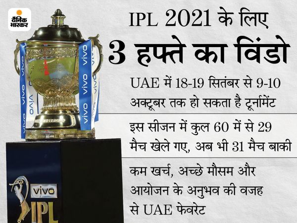 - IPL के लिए 25 दिनों के विंडो की तलाश BCCI ने कर ली है। बाकी बचे 31 मैच UAE के 3 ग्राउंड में होंगे। बोर्ड के मुताबिक अमीरात क्रिकेट बोर्ड भी इससे खुश है।