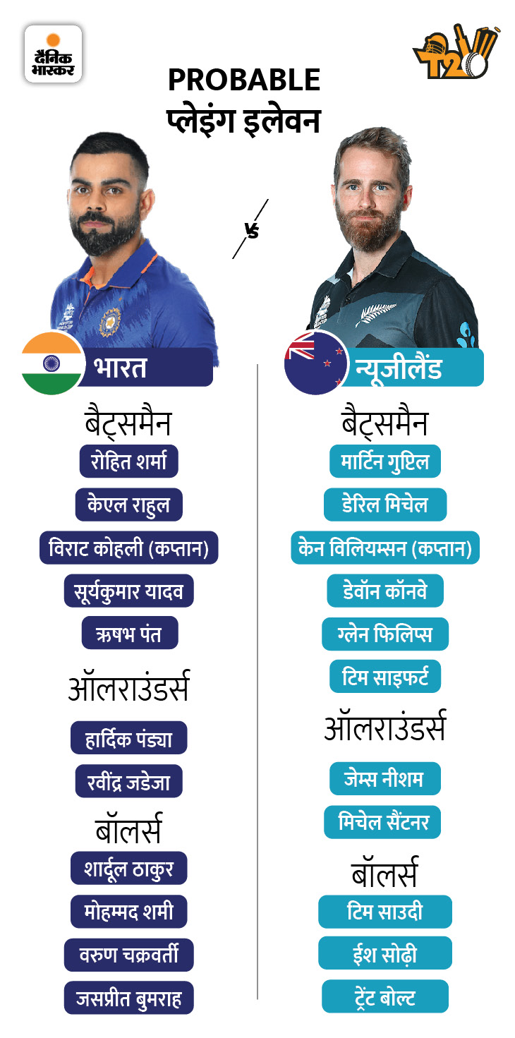 - इस मैच के बाद भारत का सामना अफगानिस्तान, नामीबिया और स्कॉटलैंड से होगा। न्यूजीलैंड को हराने के बाद इन तीनों मैचों में जीत हासिल कर भारत सेमीफाइनल में पहुंच जाएगा। इस स्थिति में भारत के 8 अंक हो जाएंगे। बाकी कोई भी टीम 6 अंकों से आगे नहीं बढ़ पाएगी।