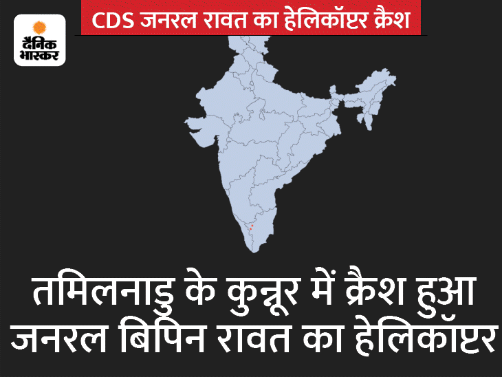 आखिरकार बुरी खबर आ ही गई है। जनरल बिपिन रावत नहीं रहे। वे देश के पहले चीफ ऑफ डिफेंस स्टाफ, यानी CDS थे। तमिलनाडु के कुन्नूर में बुधवार दोपहर करीब 12 बजकर 20 मिनट पर उनका हेलिकॉप्टर क्रैश हो गया था। उसमें जनरल रावत की पत्नी मधुलिका रावत समेत सेना के 14 लोग सवार थे। इस हादसे में 13 लोगों की मौत हो गई है। एक के घायल होने की खबर है।
